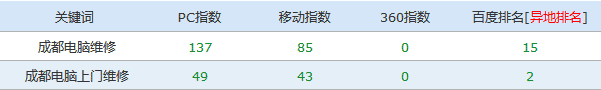 客戶自然是想試效果,雖然成都電腦上門維修這個詞的搜索指數(shù)不高,跟其它詞比起來,難度也不大,但我們還是盡可能的把這個詞優(yōu)化到首頁前三,這就是成都SEO達人的態(tài)度,拿人財錢,在排名方面絕不手軟,讓排名剛剛的。
